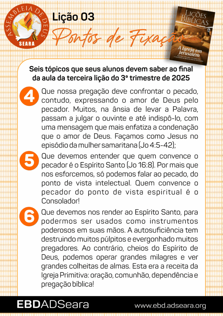- Que nossa pregação deve confrontar o pecado, contudo, expressando o amor de Deus pelo pecador. Muitos, na ânsia de levar a Palavra, passam a julgar o ouvinte e até indispô-lo, com uma mensagem que mais enfatiza a condenação que o amor de Deus. Façamos como Jesus no episódio da mulher samaritana (Jo 4:5-42);