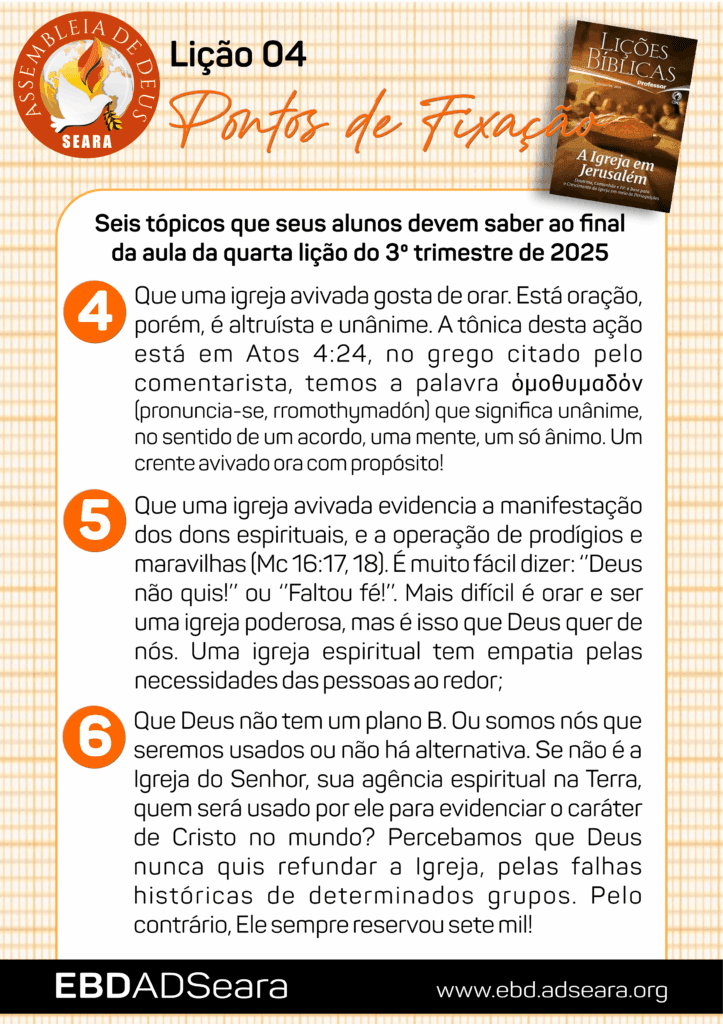 - Que uma igreja avivada gosta de orar. Está oração, porém, é altruísta e unânime. A tônica desta ação está em Atos 4:24, no grego citado pelo comentarista, temos a palavra ὁμοθυμαδόν (pronuncia-se, rromothymadón) que significa unânime, no sentido de um acordo, uma mente, um só ânimo. Um crente avivado ora com propósito!